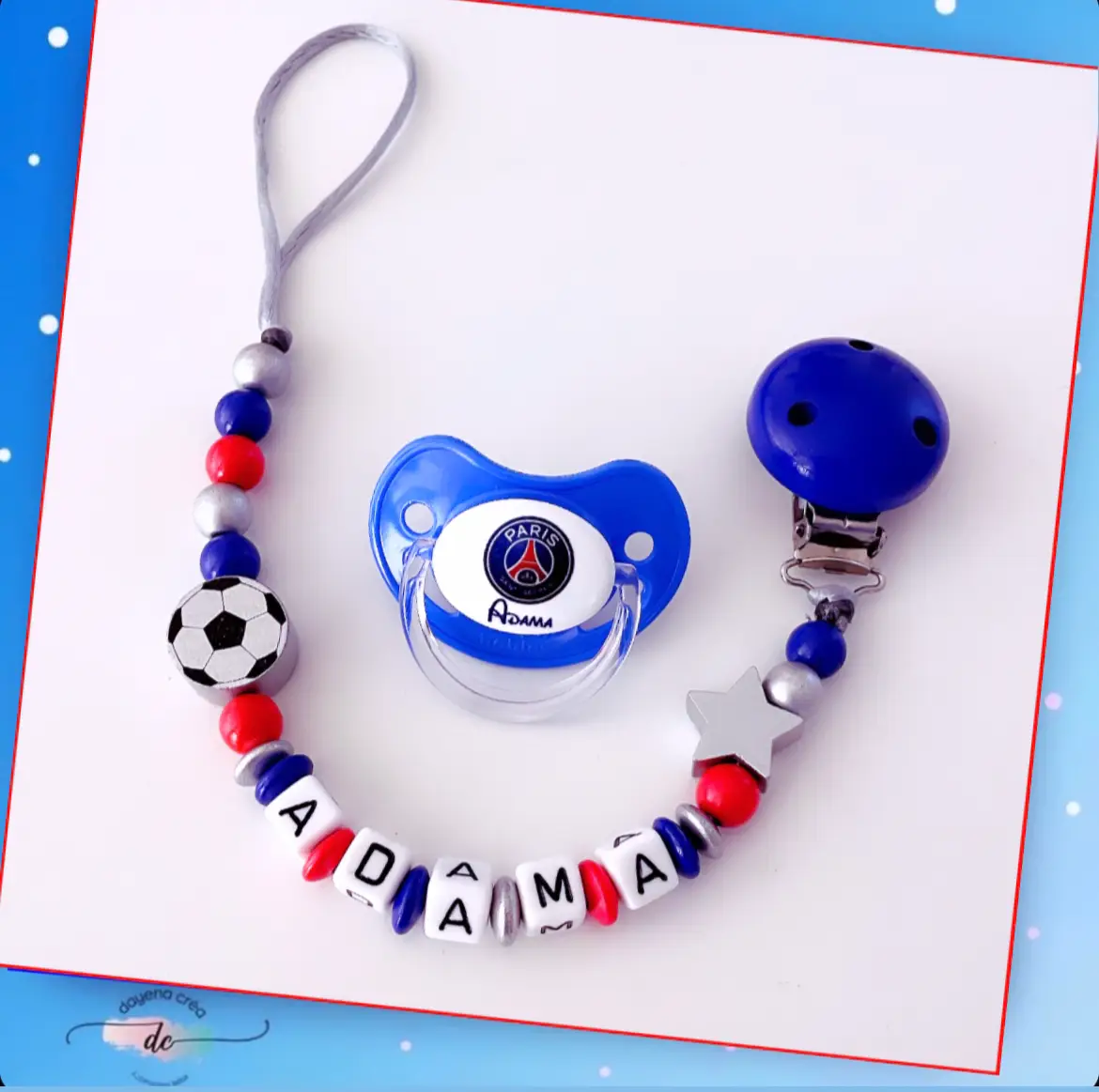 Duo Attache tétine bois  + tétine personnalisé PSG  .