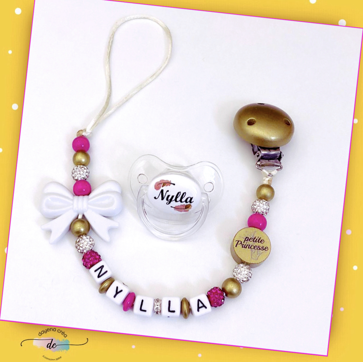 Pour la sécurité de vos enfants Nos attaches tétine seront réalisés  selon les normes françaises de 22cm clip et boucle comprise.