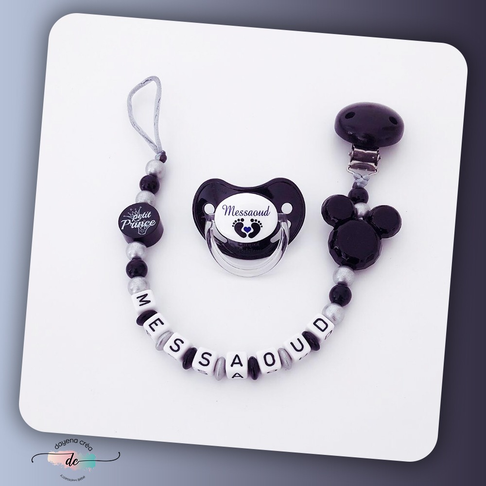 Composé de perles rondes en bois ainsi  qu’une tetine dont vous Choisirez l’embout de votre choix