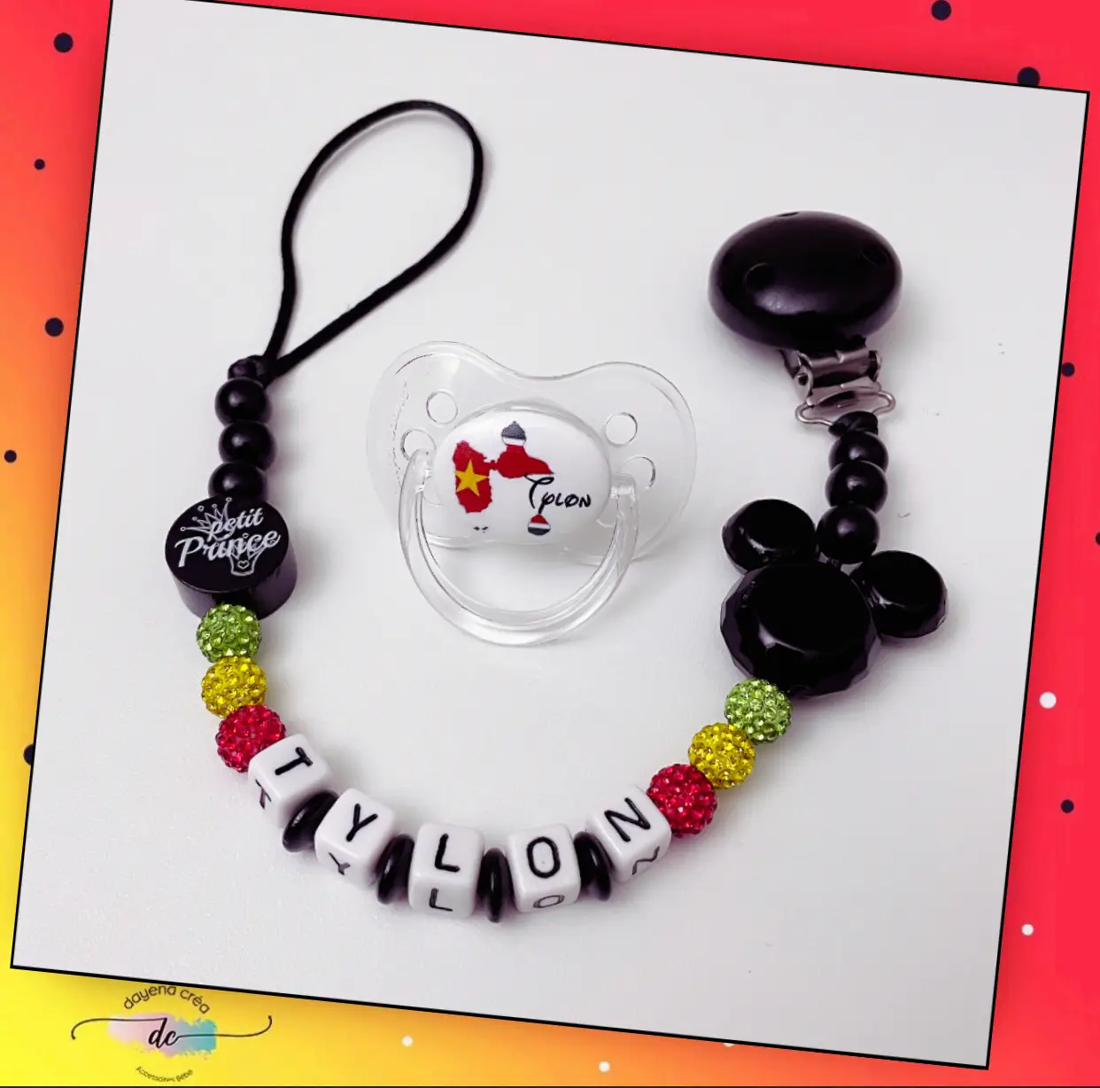 Composé de perles rondes en bois   ainsi  qu’une tetine dont vous Choisirez l’embout de votre choix